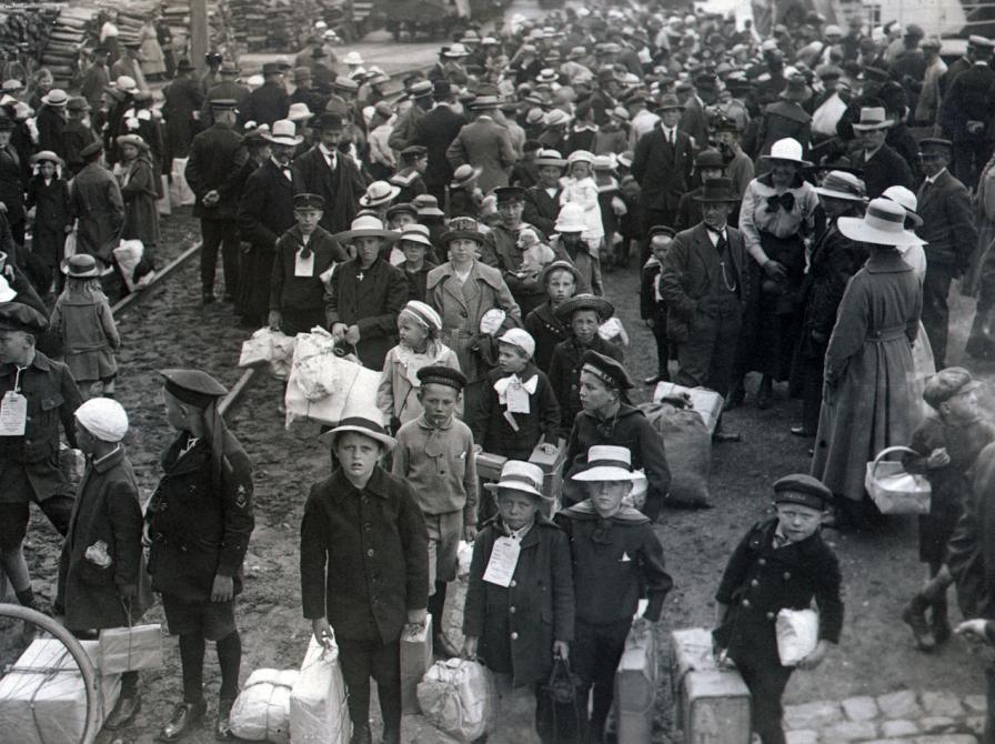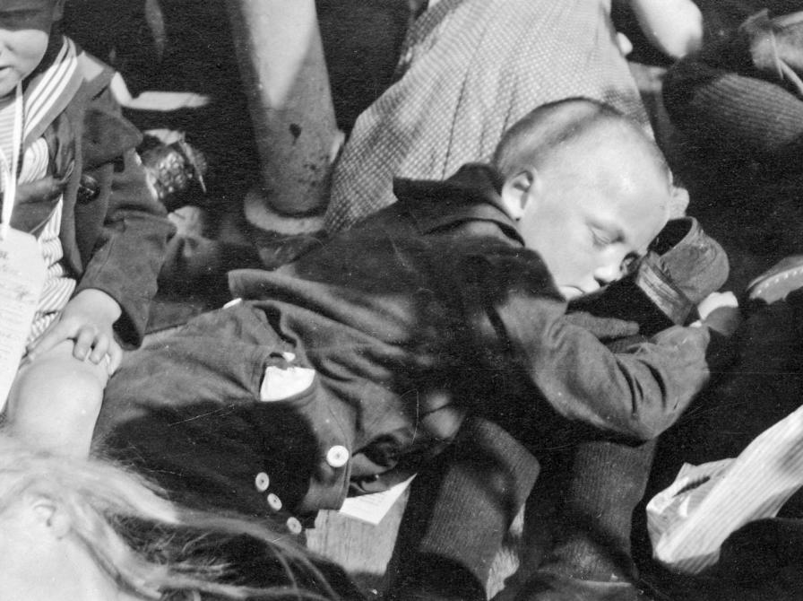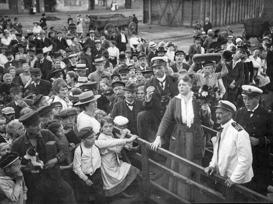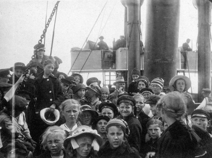 Børn ombord på damperen „Aegir“. Både da skibet ankom og sejlede afsted igen, stimlede folk sig sammen på havnen. Det var ikke ualmindeligt, at børn piskede stemningen op med flag og sange, så politiet måtte gribe ind.